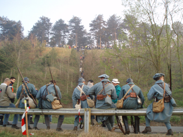 Ceux qui ont choisi de porter le costume des "poilus" prennent un instant de repos tandis que les marcheurs parviennent tant bien que mal à se hisser sur le plateau. Peut-être mesurent-ils la difficulté de l'entreprise quatre-vingt-dix ans plus tôt, sous un déluge de feu...
