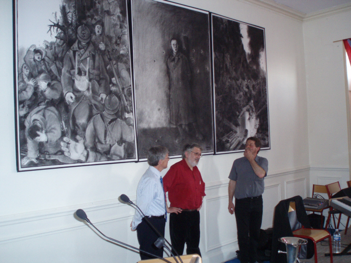 Cette journée à la Mairie de Craonne s'est conclue par un moment fort: en présence du Président du Conseil Général de l'Aisne, Yves Daudigny (au centre), le dessinateur Jacques Tardi (à gauche) fait cadeau à Craonne et à son maire Noël Genteur (àdroite) d'une oeuvre au fusain réalisée pour ce 90e anniversaire, ici sur le point d'être dévoilée.