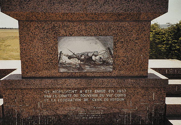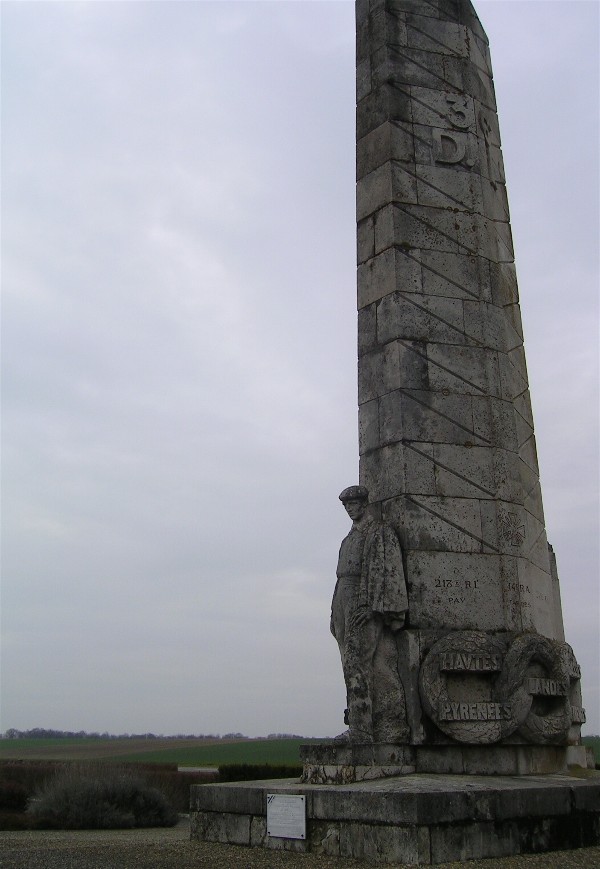 Monument érigé en 1957 "aux héros et martyrs des offensives d'avril 1917". Reproduction d'une version du Golgotha d'André Lagrange, "qui évoque la dernière station du calvaire du poilu" selon L'Almanach du combattant. L'oeuvre se trouve également dans la chapelle de Cerny. Le Christ en croix y surplombe le poilu.