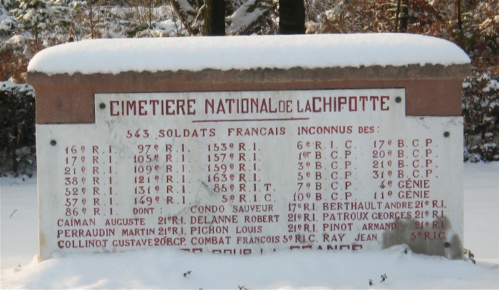 Tombe collective, cimetière de la Chipotte. L'inscription "Morts pour la France" est partiellement recouverte de neige.