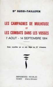 Les campagnes de Mulhouse et les combats dans les Vosges. 7 août – 14 septembre 1914. Notes recueillies par un aide Major du 23e d’infanterie, Dr Bussi-Taillefer, Niort, Imprimerie Nicolas (Niort), 1965, 122 pages