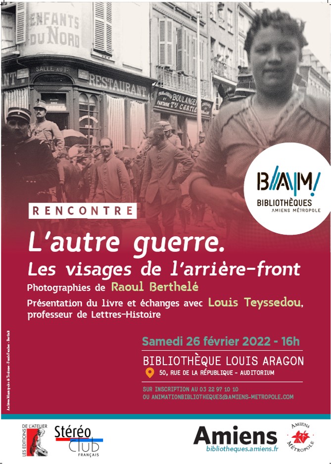 La bibliothèque Louis-Aragon propose une rencontre avec Louis Teyssedou autour du livre L’autre guerre. Les visages de l’arrière-front, qui présente les photographies de Raoul Berthelé. Raoul Berthelé est un officier de l’armée française qui fut en cantonnement à Amiens de mars à août1915. Il a pris, lors de cette période, 400 photographies qu’il a méticuleusement légendées. Ces clichés constituent un témoignage de première importance quant à la vie de l’arrière-front français lors du premier conflit mondial.