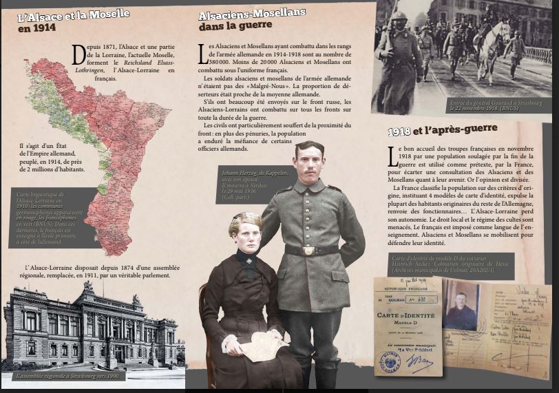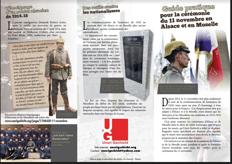 L’histoire de cette région y rend forcément la date du 11 novembre très particulière. Le travail de l’association Unsri Gschìcht est à cet égard des plus intéressants, comme le montre, outre la consultation de son très riche site, le dépliant spécialement réalisé à l’approche de la commémoration de l’armistice.