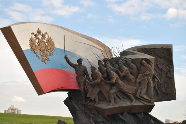 il grande monumento costruito nel Park Pobedy (Parco della Vittoria), all’inizio del lungo viale pedonale che conduce alla Poklonnaja Gora, la “Collina degli inchini” sulla quale sorge il principale Museo-Memoriale della Grande guerra patriottica del Paese, detto anche Museo della Vittoria. Si tratta di un bassorilievo di grandi dimensioni, con figure a grandezza naturale, che ritrae soldati semplici e ufficiali che caricano il nemico. L’elemento più importante è però la sua posizione, che riveste un grande significato perché colloca la Prima guerra mondiale nell’attuale processo di costruzione di un nuovo immaginario e di una nuova identità nazionale per la Russia, postsovietica ma non completamente omologata al contesto euro-americano. Il monumento ha infatti una collocazione baricentrica nel rettifilo che collega l’arco trionfale progettato nell’Ottocento per commemorare la vittoria russa su Napoleone (si dice che sorga dove Bonaparte attese invano la resa russa), e il Memoriale costruito tra il 1986 ed il 1995 per eternare il ricordo della Seconda guerra mondiale. Ê un monumento di tipo tradizionale che, per la resa dei personaggi, vuole eternare la capacità di resistenza e di eroica sopportazione del soldato russo, quasi a costituire il fil rouge dell’esperienza bellica del Paese, rappresentata come una costante difesa contro gli attacchi che giungono da ovest. Questo monumento, come d’uso dedicato “agli eroi”, è stato inaugurato il 1° agosto 2014 dal presidente Putin;