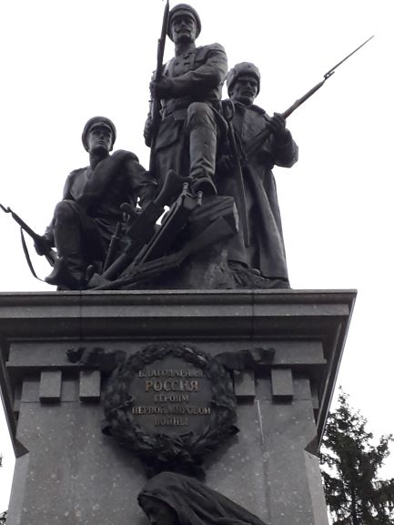 Tra gli altri, è da citare quello di Kaliningrad, la Königsberg tedesco-prussiana che i sovietici ottennero nel 1945 con quella parte della Prussia orientale che non fu consegnata alla Polonia, e che oggi costituisce l’oblast omonimo. Ma l’annessione fu conseguente alla Seconda e non alla Prima guerra mondiale e, tra il 1914 ed il 1917, la città rimase sempre saldamente in mano tedesca. Non fu lontanamente minacciata dai combattimenti, pur costituendo il principale centro militare ed amministrativo dello schieramento bellico tedesco contro la Russia, l’Ostfront, e, tra il 1919 ed il 1921, dell’azione della Repubblica di Weimar nel caotico contesto baltico. Nonostante ciò, la Federazione Russa ha ritenuto che fosse importante eternare la memoria nazionale della Grande Guerra anche in questa città, oggi incuneata tra Lituania e Polonia, nazioni ostili e appartenenti alla OTAN. E la collocazione del monumento, anch’esso convenzionale, è altamente significativa: alle spalle ha un tratto delle imponenti fortificazioni ottocentesche prussiane, mentre di fronte si trova il memoriale ai combattenti della Seconda guerra mondiale che, invece, ebbe uno dei suoi eventi conclusivi proprio nel sanguinoso assedio di Königsberg nell’aprile 1945. Il complesso, che ritrae soldati, ufficiali, e una crocerossina che consola un combattente morente, è rivolto verso il monumento ai soldati di tutte le specialità dell’Armata Rossa, e tra i due memoriali è stata edificata una cappella ortodossa.