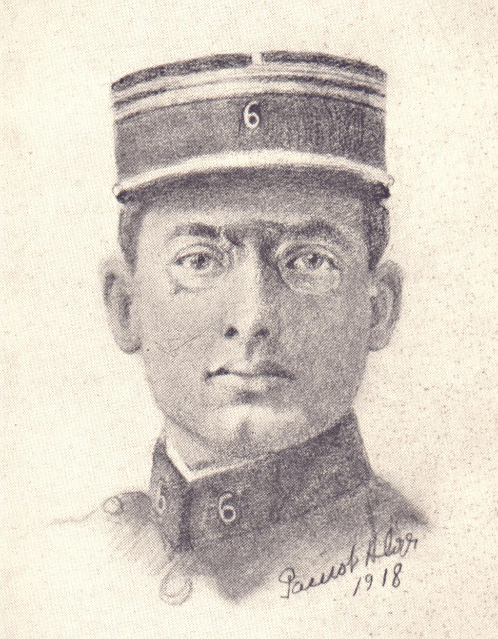 Emile-Auguste Chartier dit Alain est né à Mortagne-au-Perche le 3 mars 1868. Philosophe, journaliste et professeur de français, il publie dès 1903 plusieurs milliers de chroniques sous le nom d’Alain et est connu comme pacifiste avant guerre. A la déclaration des hostilités, bien que non mobilisable, il s’engage dans l’artillerie et est affecté au 3e régiment d’artillerie lourde. Gravement blessé au pied à Verdun le 23 mai 1916, il fait un court séjour aux services météorologiques de l’armée, sera démobilisé en 1917, restera estropié et reprendra sa carrière de professeur. Son nom reste attaché au pacifisme et à l’antifascisme. Il décède au Vésinet le 2 juin 1951 et est enterré au cimetière du Père Lachaise.