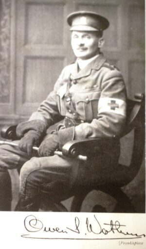 L’ouvrage s’ouvre sur une notice biographique des éditeurs qui indique que le révérend Owen Spencer Watkins est né le 28 février 1873 à Southsea, un quartier du sud de Portsmouth (Angleterre). Son père, Owen Watkins, est lui-même révérend, pionnier du champ missionnaire de l’Afrique centrale. Il fait ses études à l’école de Kingswood et au Richmond college. En 1896, à l’âge de 23 ans, il est aumônier wesleyen auprès de la garnison militaire de Londres. Il sert également ailleurs qu’en Angleterre, dans le corps d’occupation en Crète (1897-1899), fait partie de l’expédition du Nil et prend part à la bataille d’Omdurman, qui se déroule le 2 septembre 1898 au Soudan, pendant la guerre des mahdistes. Il fut un des quatre aumôniers qui célébrèrent le service commémoratif du général Gordon, mort le 26 janvier 1885 à Khartoum. En 1899-1900, il se rend dans le sud africain et prend part aux batailles de Lombard’s Kop, de Nicholson’s Neck, au siège de Ladysmith, de Majuba, etc. Ces quatre années de campagnes lui apportent plusieurs citations à l’ordre du jour de l’Armée, la médaille de la Reine et la médaille de l’Egypte, avec plusieurs agrafes. Il attrape manifestement en Afrique une malaria qui le rattrape sur le front. Il parvient toutefois, par ses relations, à éviter l’hôpital de la Base, disant : « Une ambulance n’est pas faite pour s’encombrer de malades » ! Nommé honorary chaplain de 3ème classe le 19 août 1910, il est délégué à la conférence œcuménique de Toronto et aumônier du corps expéditionnaire britannique en 1914, promu à la second classe, ayant rang de lieutenant-colonel. Bien qu’il n’en parle pas dans sa lettre du chapitre V, de l’Aisne au nord de la France, correspondant à la période du 1er au 17 octobre 1914, il est cité à l’ordre du jour par le maréchal sir John French lui-même le 8 octobre. Grand amateur de golf, il a publié avant la guerre plusieurs ouvrages sur son expérience et sa mission africaines. Il réside à la publication du livre, qu’il dédie à sa femme, à Londres, dans le quartier de West Ealing. O.-S. Watkins sera une figure importante dans le développement de l’aumônerie méthodiste et poursuivra sa carrière d’aumônier général. Il quitte l’armée en 1928 et décède en 1957.
